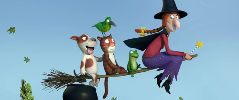 En snäll häxa låter en brokig skara djur ta plats på kvasten, vilket inte uppskattas av hennes katt. När häxan…