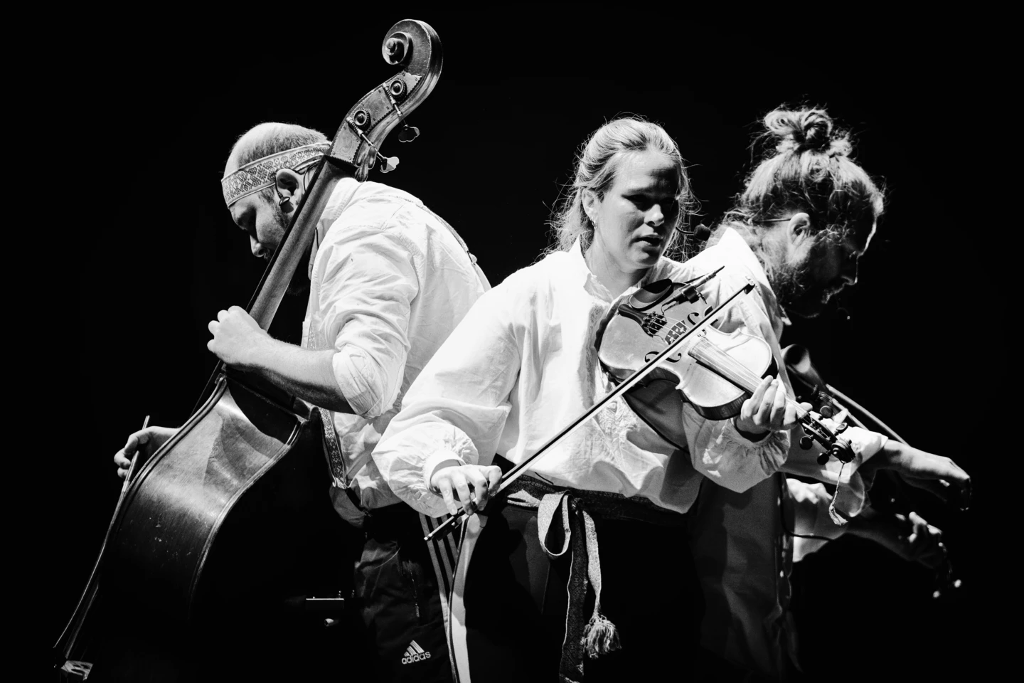 Skånsk folkmusik där ljudet av fioler i tre oktaver, fötter som stampar och röster i brokiga klanger bjuder med publiken…